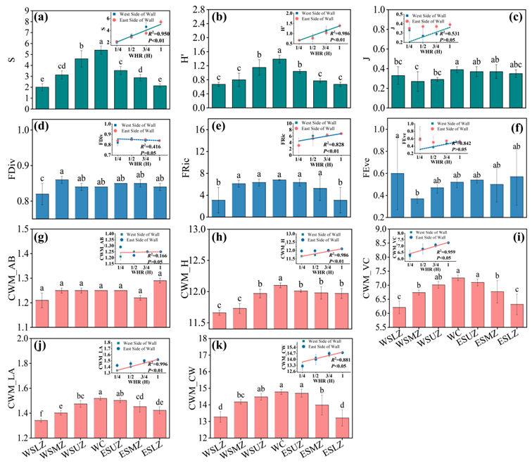 图1 长城遗址不同微空间位置物种丰富度(a)、物种多样性(b)、物种均匀度(c)、功能均匀度(d)、功能分化度(e)、功能丰富度(f)、群落加权平均_生物量(CWM_AB, g)、群落加权平均_株高(CWM_H, h)、群落加权平均_盖度(CWM_VC, i)、群落加权平均_叶面积(CWM_LA, j)、群落加权平均_冠幅(CWM_CW, k)变化情况.